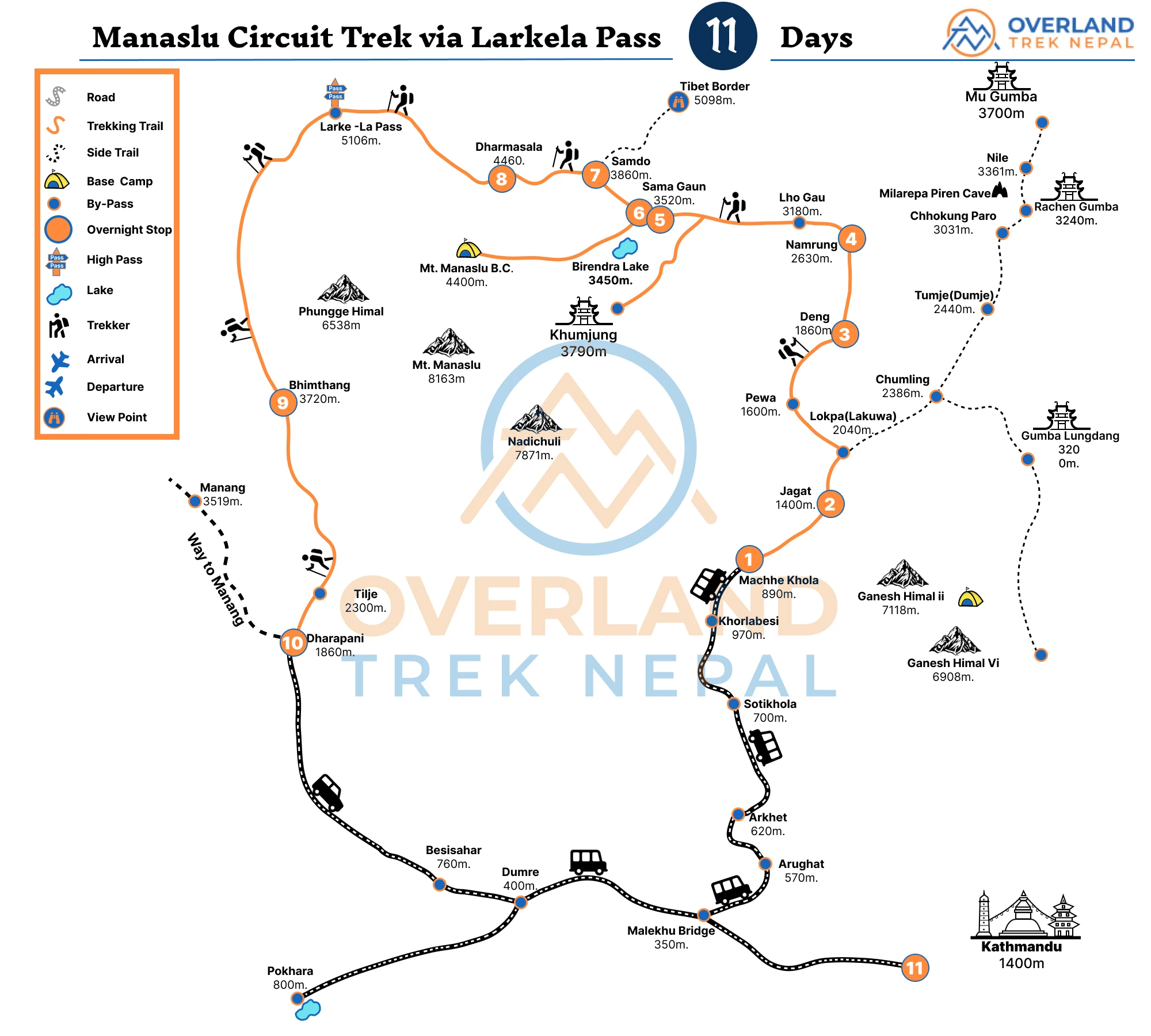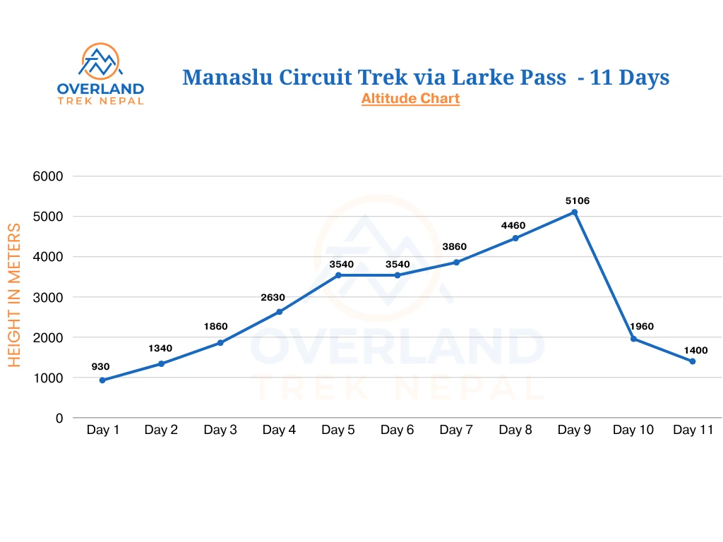 Below is a short and well-balanced Manaslu Larkya Pass Trek Itinerary designed for active trekkers. Our guide from Overland Trek Nepal has designed this itinerary of 11 Days